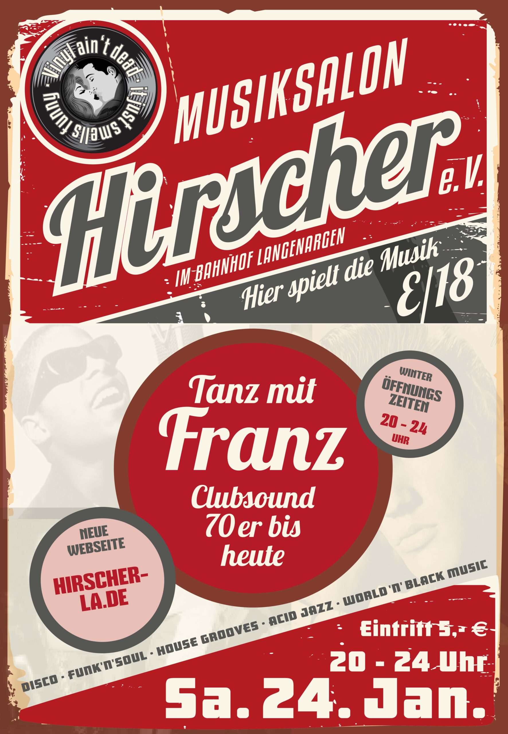 Er ist der Spezialist für gepflegten Clubsound und groovige Lines. Franz Leser liebt die kleine Bühne, hautnah beim Publikum, immer in Kontakt mit der Tanzgemeinde. Deshalb legt er am liebsten in kleineren Clubs auf und sein Thema für den Hirscher am Samstag ist Clubsound aus den 70ern bis heute. Der Bogen spannt sich von Disco, Funk, Soul, über Acid Jazz, Dancefloor, World & Black Music, Latin bis hin zu housigen Grooves. Also immer im Rhythmus, wo jeder mit muss. Franz wird gleich um achte loslegen. Gin Tonic und Cuba Libre gibt’s wieder für 6,50- €. Eintritt 5,- € für DJ und GEMA. Berthold und das Saturday Night Tanz Team mit Andrea, Wolfi, Schäpp und Lukas.